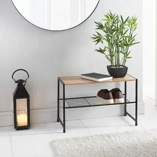 Includes a top shelf in a light oak finish, with a rack underneath to store shoes and other household accessories.